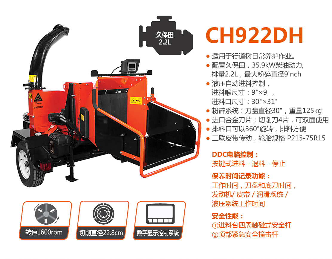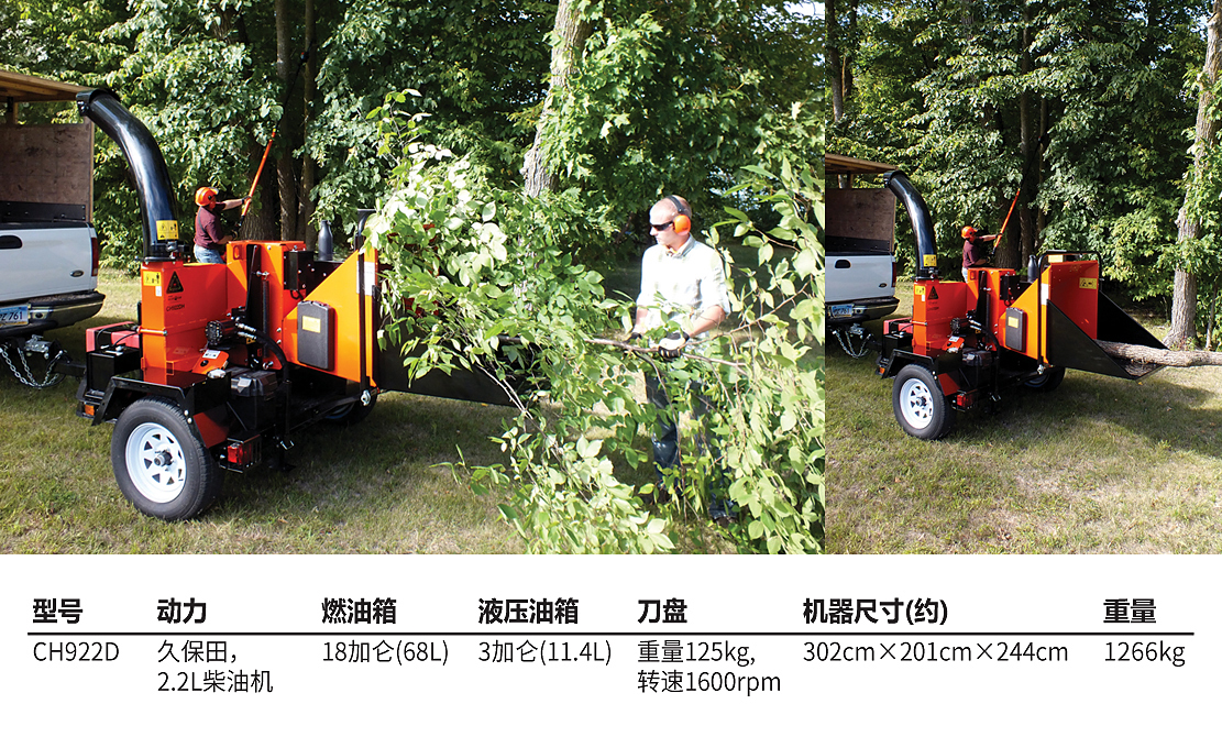 老熊(BEARCAT)品牌樹枝粉碎機,配置久保田2.2L柴油機,動力更強勁,最大可切削直徑23cm樹枝;